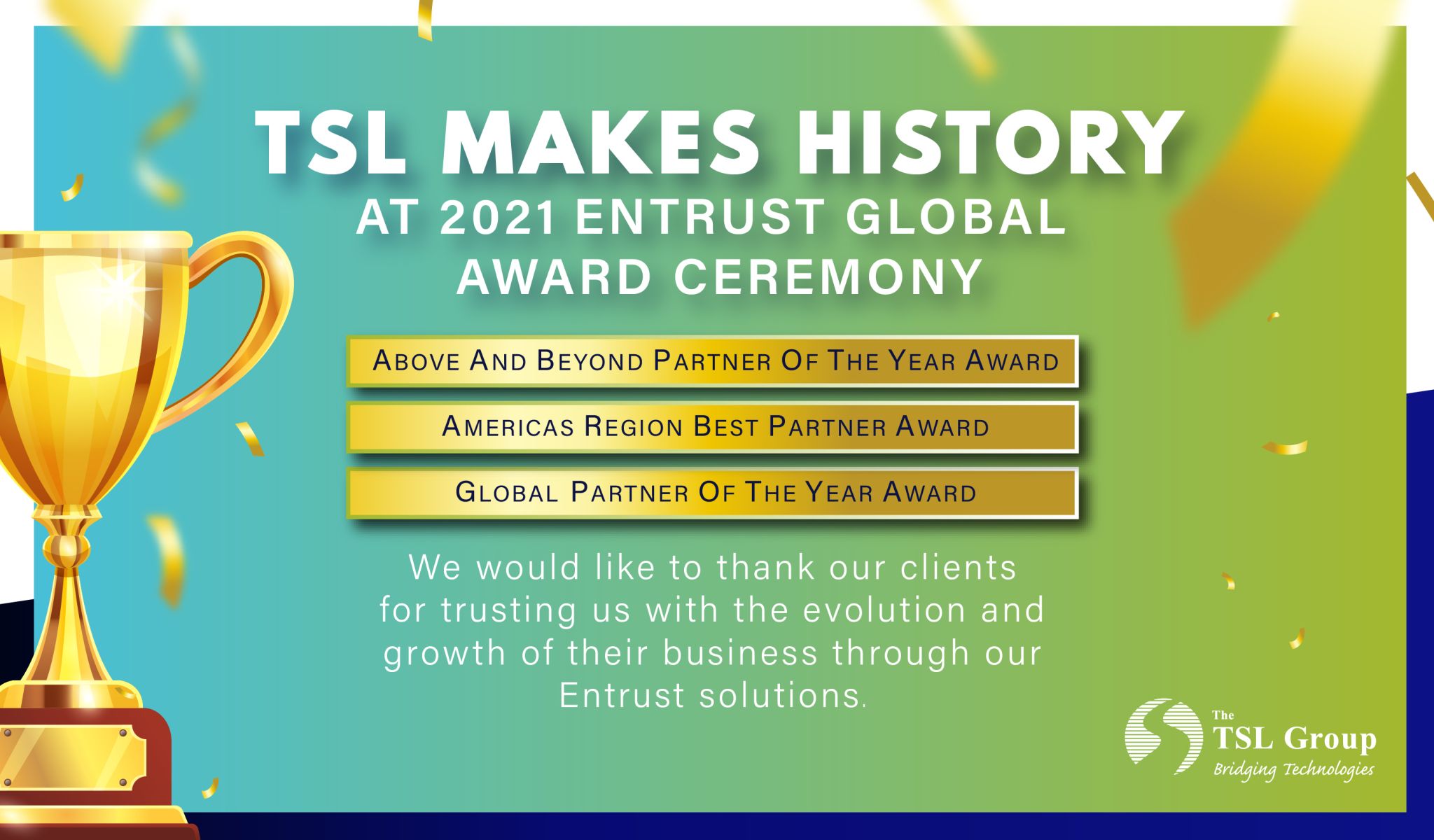Lastly, the Global Partner of the Year Award that spans across Europe, the Middle East, APAC, Africa and the Americas and is awarded to the best performing Entrust partner overall. For the first time in 3 years, the winner of this award hails from the Americas region which is a tremendous honour for us here at TSL. Our small team went above and beyond in embracing the entire Entrust portfolio and finding opportunities for success in the midst of all the challenges.